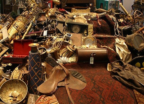 A box of porcelain roosters suspended in newspaper shavings; a row of Country Crock tubs packed twenty deep like Matryoshka dolls; a set of golf clubs held together by a bungee cord; a stack of record sleeves that brushed the ceiling; boxes; crates; an actual metal washboard; a cathode ray television with a spool of cable around the base like spilled intestines; a watercolor painting; a cavalry saber that looked old enough to have seen service in the Civil War.