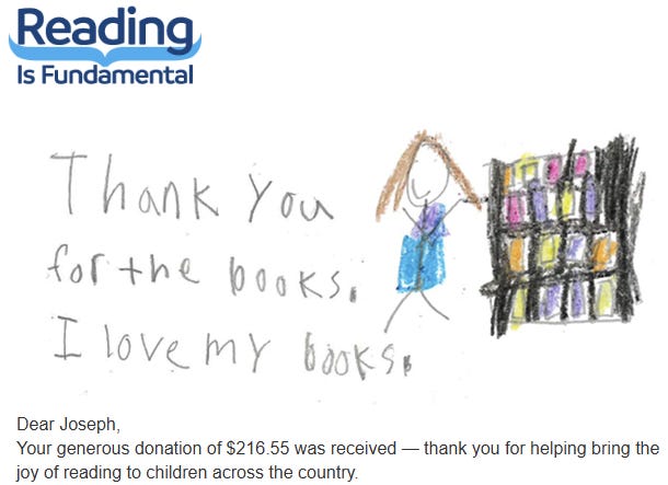 As a result, I’m pleased to announce that I made $250 in subscription revenue last year. After Substack’s cut and Stripe’s processing fees, that leaves $216.55 for my chosen charity, Reading is Fundamental.